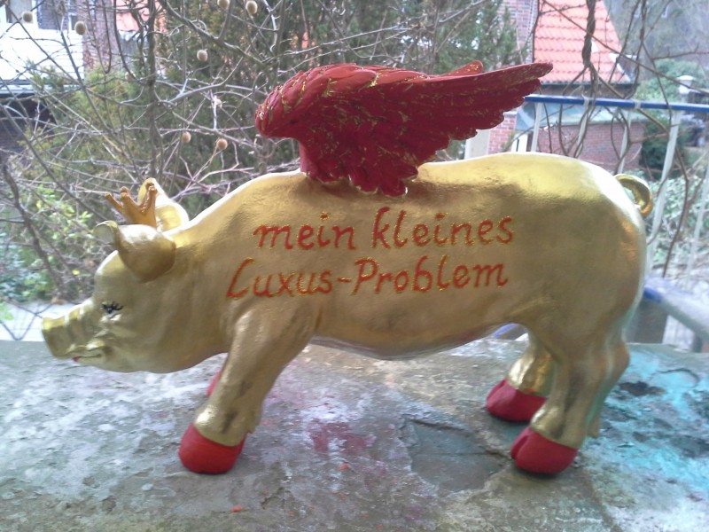 Individuelles, grosses Sparschwein mit Flügeln. Bemalt mit Wappen, Wahrzeichen und Kunst-Skulpturen.